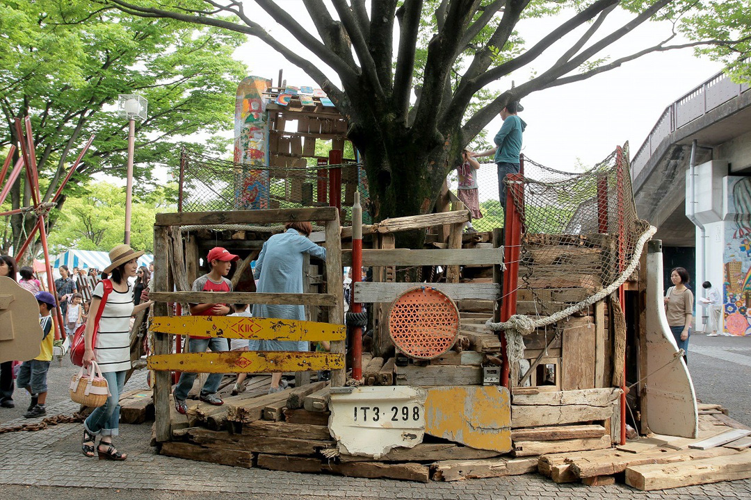 岩手県の宮古市、震災で壊れた町の破片が郊外の広い土地に集められていた。それらを利用して東京の代々木公園で子どもの遊び場に。これがきっかけで東北で起きたことをよく考えるようになる。山梨県富士吉田市で設立後最初のツリーハウスを製作。