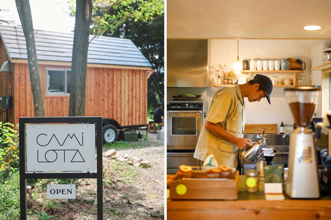 ビレッジを開拓しながら、定期的にオープンハウスを開催するように。いろいろな人と出会い、タイニーハウスに興味を持つ人の将来の夢を聴くことから、その人の暮らしや営みにタイニーハウスがどのように役立つのか考えていた。沖縄石垣島から移住をしてきたご夫婦と出会い、タイニーハウスを活用したコーヒーショップ「CAMILOTA」を製作。